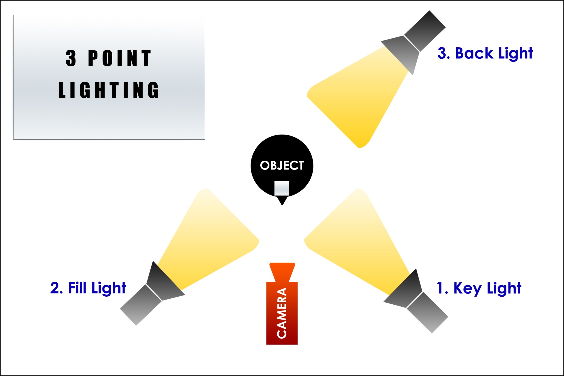 Three point lighting is one of many methods used to illuminate a subject in a scene wether it be an object or a person, this method has three distinct lighting positions.