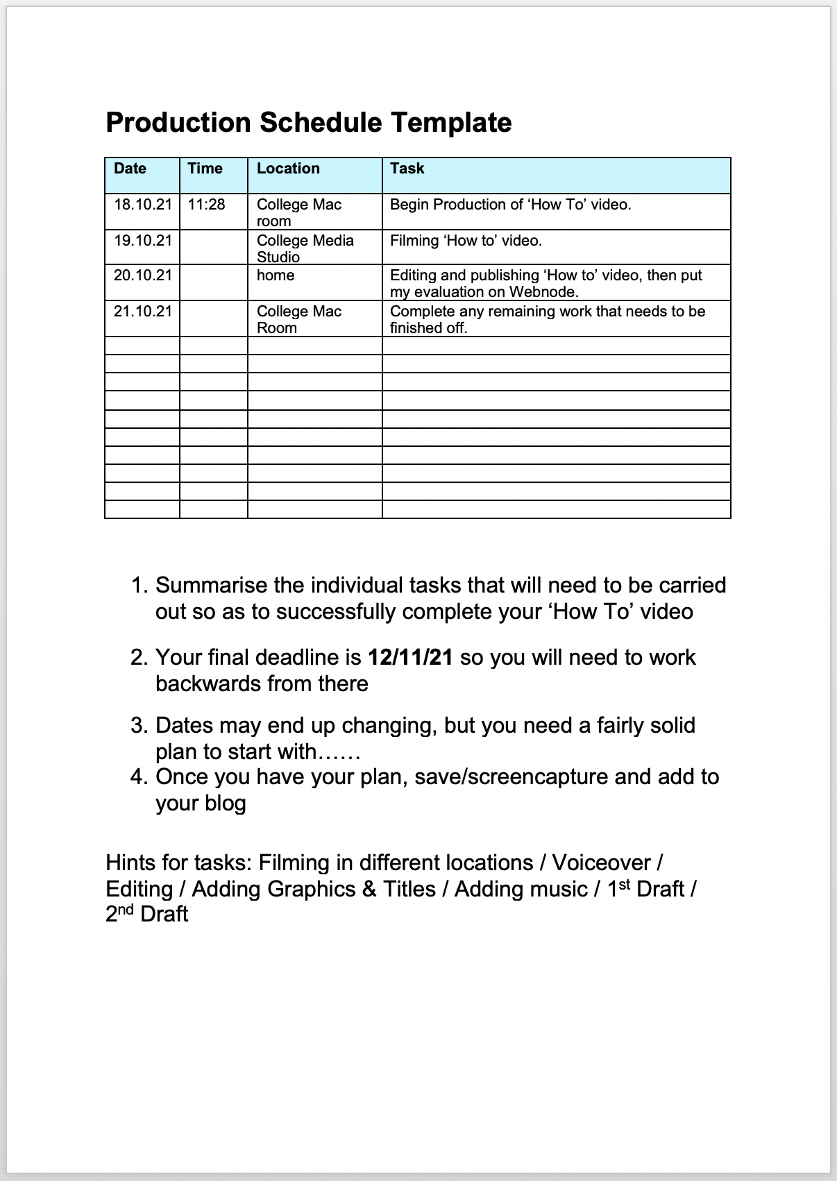 18.10.21: Today I filled out a production schedule for my project, Below is the schedule showing what day I'll be working on my project and what task I'll be doing on that day.